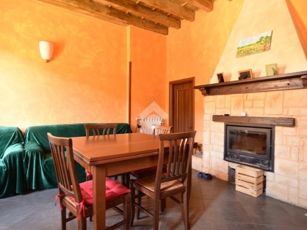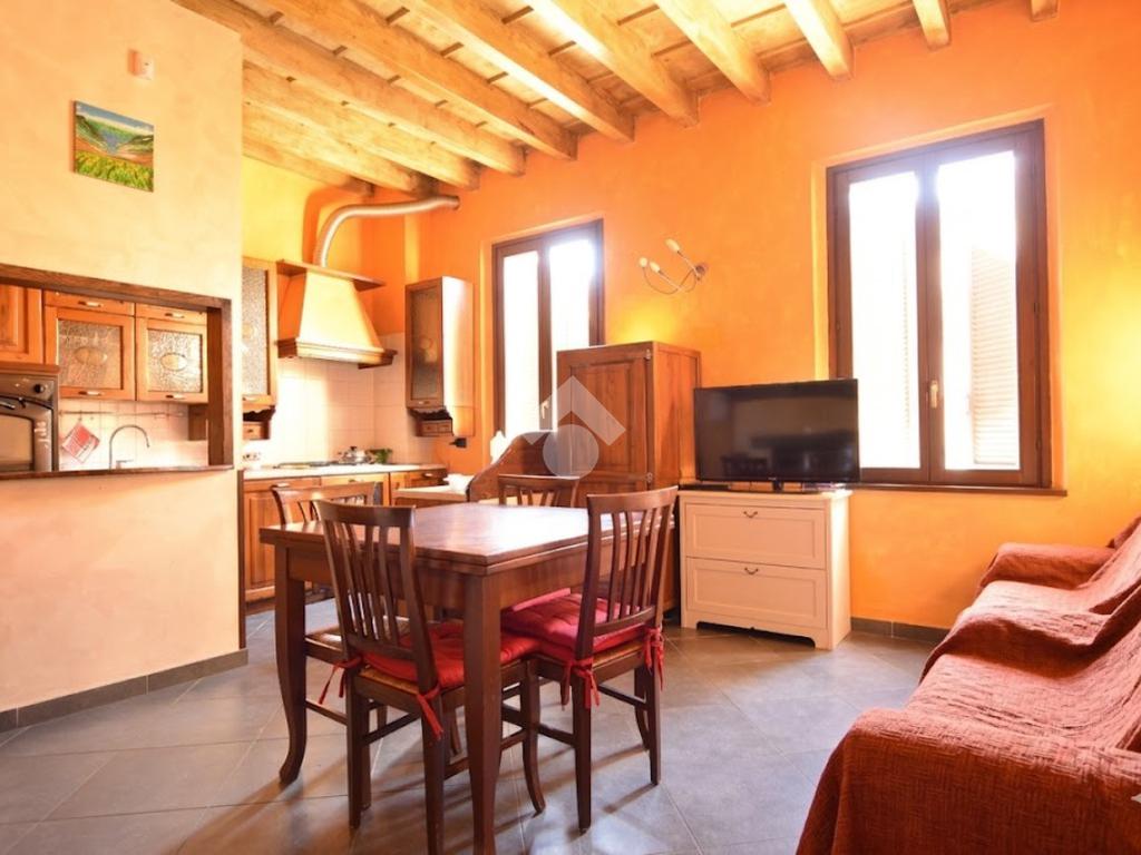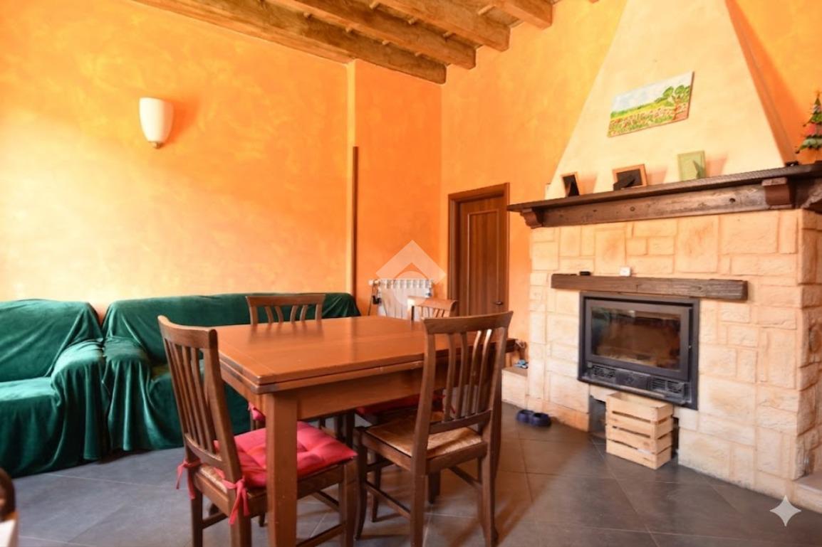 Ingresso al piano terra che si apre nel soggiorno con camino e angolo cottura, camera e bagno con doccia.